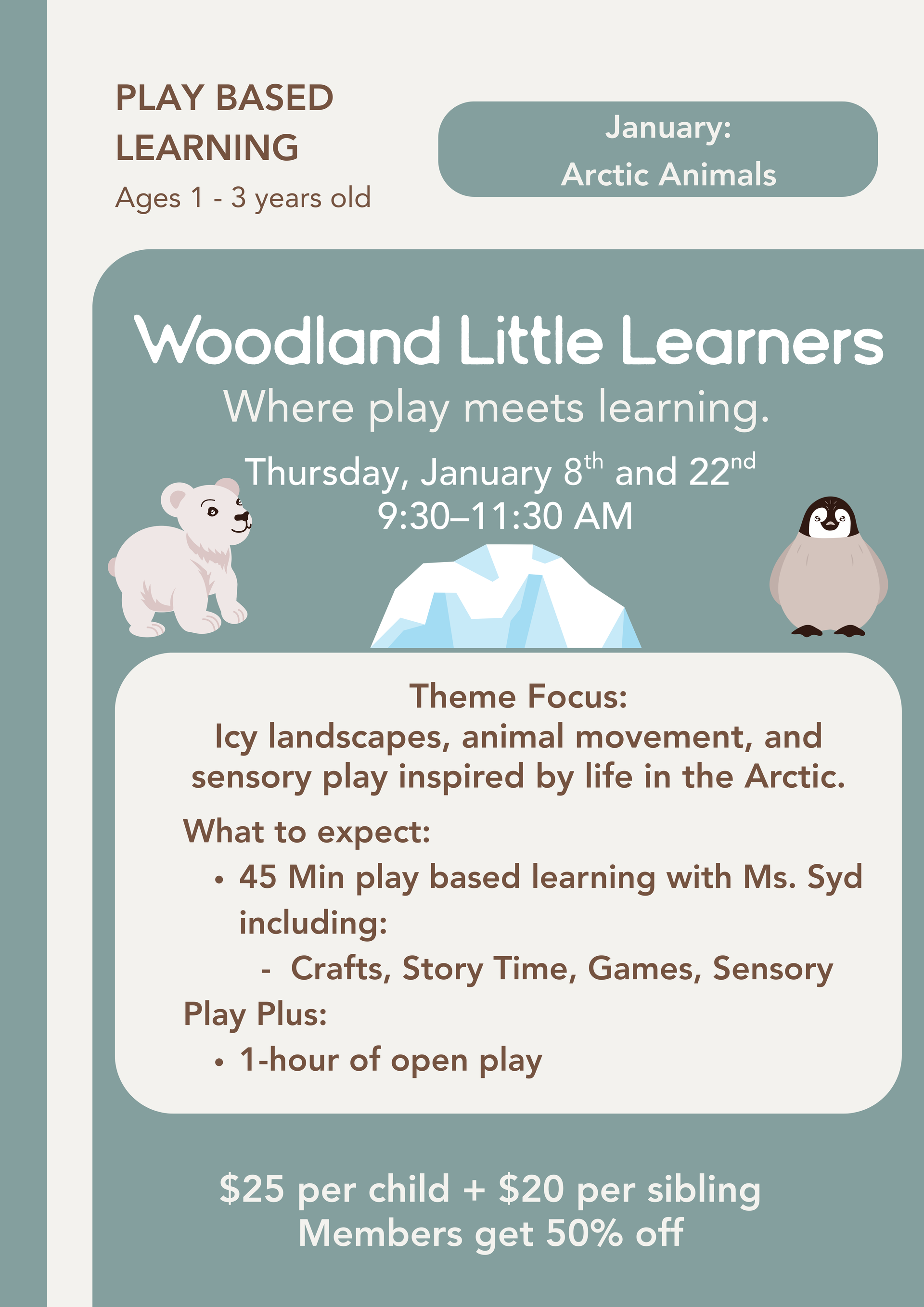 January’s Woodland Little Learners explores Arctic animals through music, movement, stories, and sensory play inspired by wintery textures. Perfect for ages 1–3, each class includes 45 minutes of guided play plus one hour of open play.