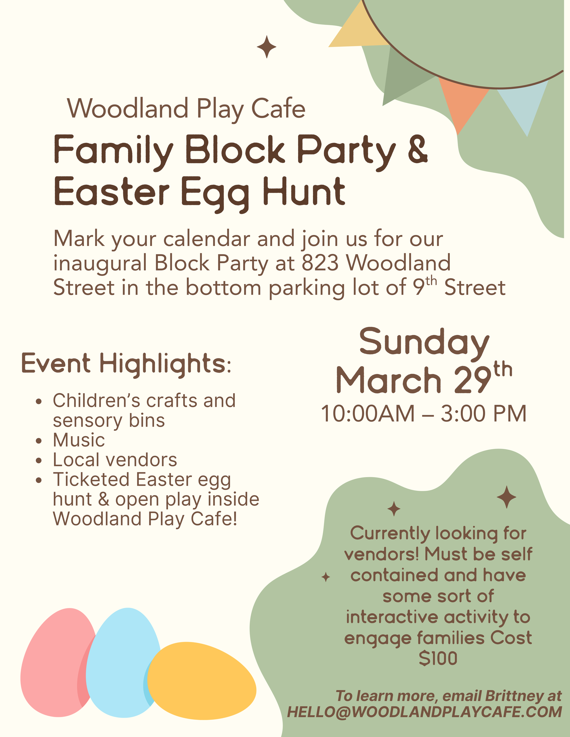 Join us for a spring celebration in the parking lot at Woodland Play Cafe! What to expect: Local vendors, live music, kids activities & community fun for everyone.